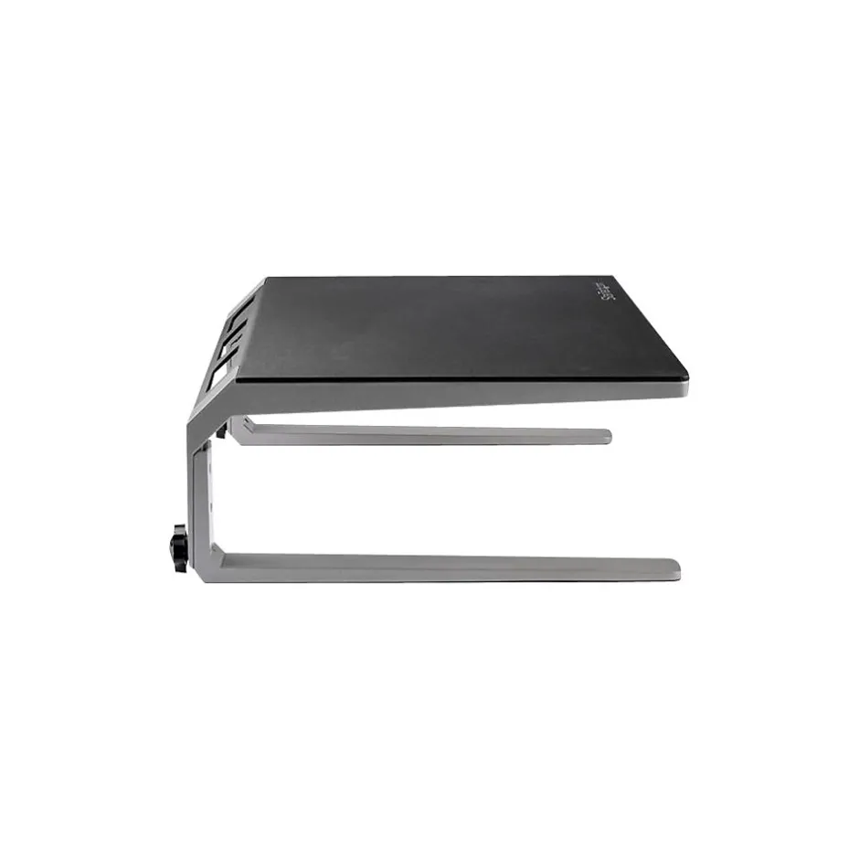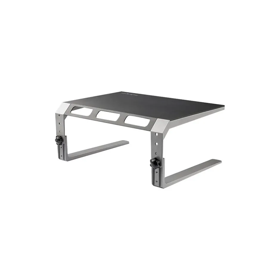 Create a more ergonomic workspace. This strong and sturdy monitor riser stand lifts your display off of your desk for more comfortable viewing, helping to prevent neck strain. Its attractive silver and black design adds to the aesthetic appeal of your workspace, and creates storage space underneath. Elevate your display to position your monitor. You can customize the height of the computer monitor riser, adjusting easily to three different heights: 4.9″, 5.9″ or 6.9″ (12.5, 15 or 17.5 cm) off the desk surface. With a robust 10.5″ x 16″ steel surface area and an aluminum base, the monitor riser provides a stable platform for a monitor up to 32″ with maximum weight capacity of up to 22 lb. (10 kg). You can also use it for your laptop. The non-skid bottom surface of the feet provides a solid grip while protecting your desk surface from scratches and scuff-marks. It’s ideal for a variety of desk surfaces including glass-top desks. Maximize your work space and create a clutter-free area. Store your mouse, phone, and other items underneath the monitor shelf so they are out of view, but not out of reach. You can also use the riser stand to raise your printer, freeing up desk or counter space underneath. The integrated cable management slots keep cables organized and out of view. With fast and easy setup, you’ll be ready to work with the monitor riser within minutes.