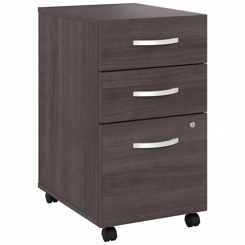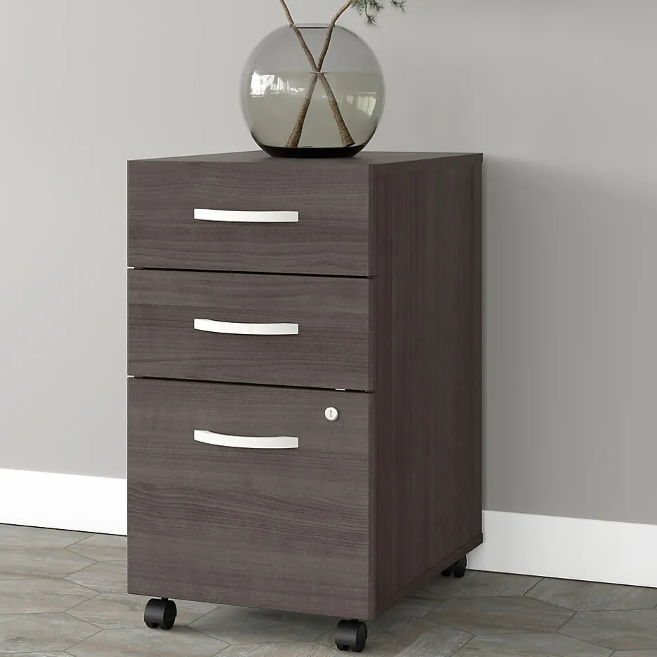 The Bush Business Furniture Studio A three-drawer mobile file cabinet combines a fresh contemporary appearance with the commercial-quality construction needed to withstand years of everyday use. The file drawer opens on smooth full-extension ball bearing slides for an effortless reach to letter-, legal-, and A4-size paperwork, while two box drawers organize writing utensils, notepads, and more. The two bottom drawers can be secured by a single lock to protect sensitive files and personal items. The rolling file cabinet’s compact design allows it to fit underneath a standard-size office desk for a space-saving configuration. This three-drawer file cabinet with wheels has been meticulously tested to meet or exceed the ANSI/BIFMA standards for safety, durability, and performance and is backed by the Bush Business Furniture 10-year manufacturer limited warranty. American-made with US and imported parts.