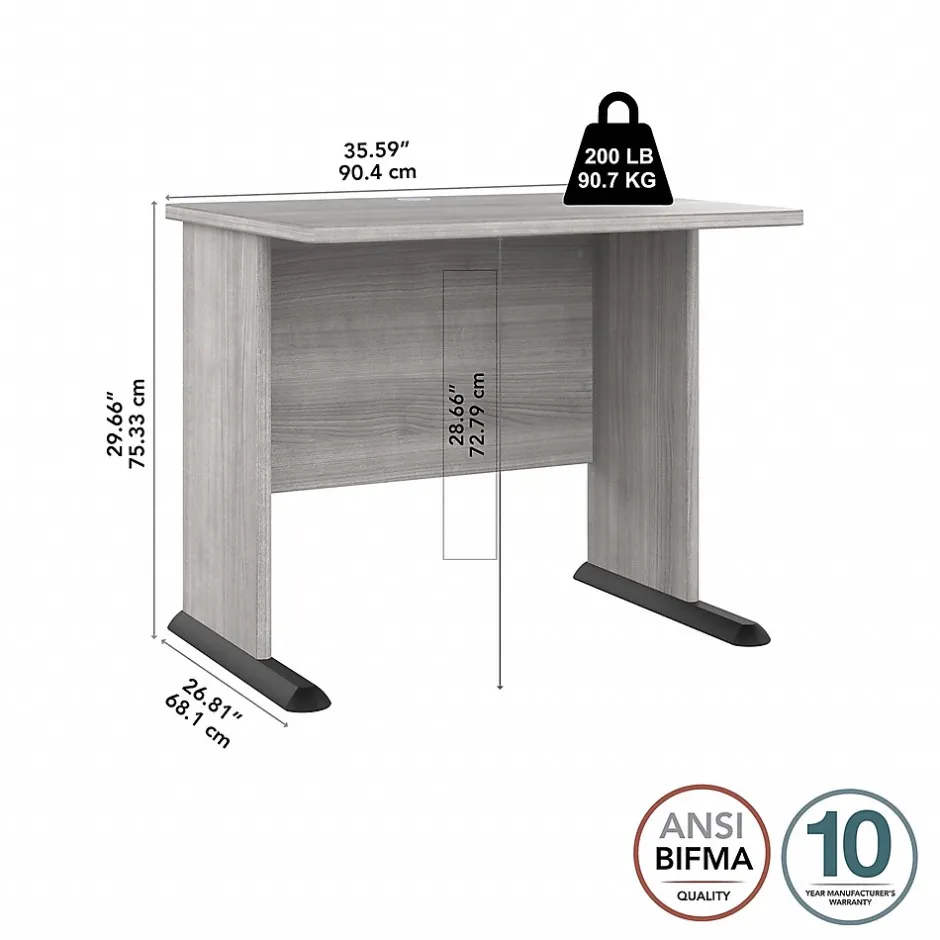 The Bush Business Furniture Studio A 36″W small computer desk combines a fresh contemporary appearance with the commercial-quality construction needed to withstand years of everyday use. A compact surface makes this small desk a perfect choice for working or gaming in areas where space is limited. Set up with a computer and equipment on the durable thermally fused laminate desktop that supports up to 200 lbs. A built-in wire management grommet keeps cords and cables in order, so the surface remains free from unnecessary clutter. Wall attachment hardware is included for maximum safety and security in any home or professional office. This compact desk has been meticulously tested to meet or exceed the ANSI/BIFMA quality standards for safety, durability, and performance and is backed by a 10-year manufacturer warranty. American-made with US and imported parts.