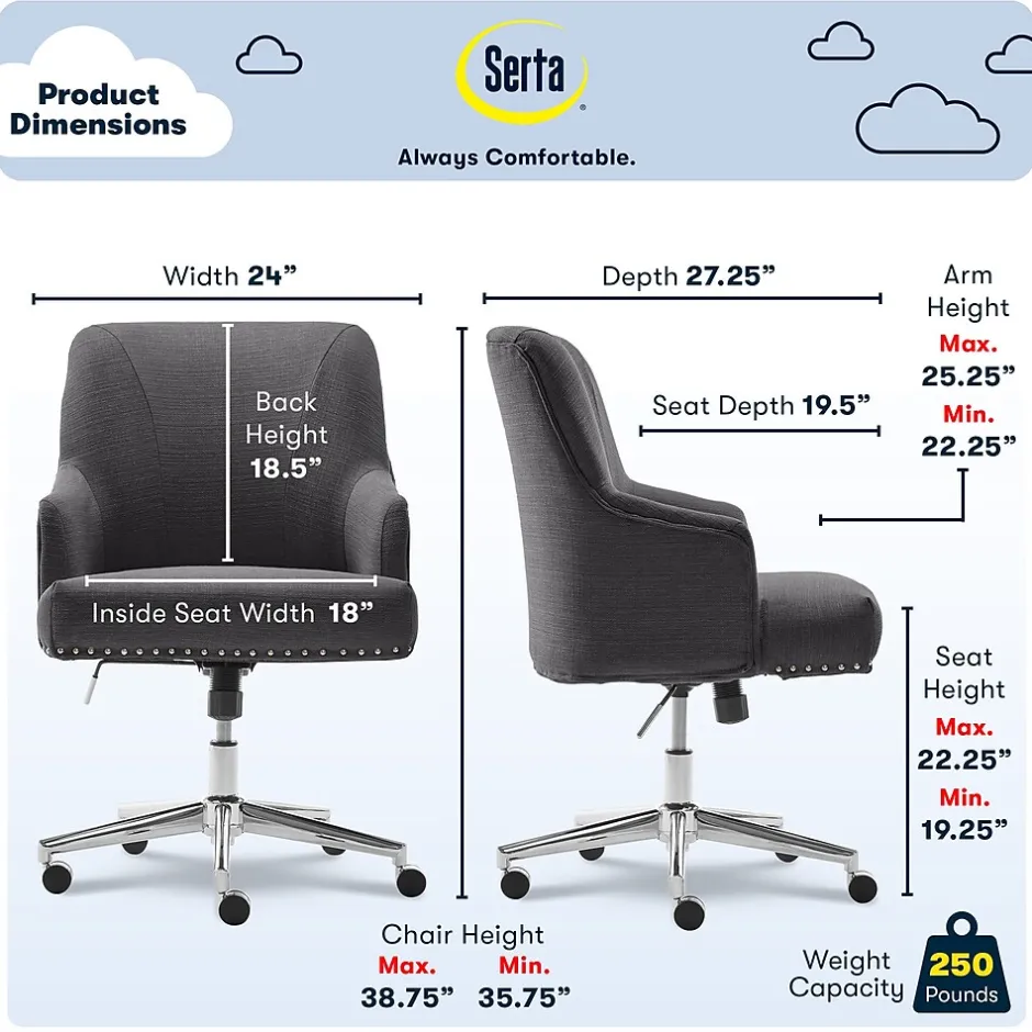 Office workspace, meet Leighton: A classic design, built for comfort. Sink into the soft memory foam cushions and you’ll never go back to an ordinary office chair again. If you’re always on the move, the durable rolling casters are suited for any floor type. A combination of timeless lines and crisp chrome detailing, the Serta Style Leighton Home Office Chair is a chic office essential!
