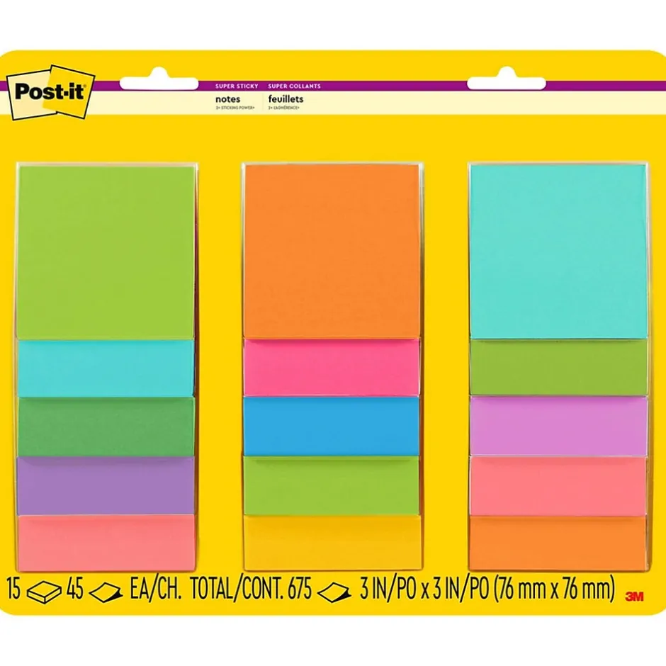 Post-it Super Sticky Notes in 3 in. x 3 in. feature 2x the sticking power. Use for notes or reminders on doors, windows or walls. Unique adhesive reliably sticks and re-sticks so your message can stay front and center. Move your notes with you throughout the day. Energy Boost and Playful Primaries collection colors bring a rainbow of bright colors to use for color coding, or organizing a large project. Post-it Super Sticky Notes are recyclable and the paper in Post-it Super Sticky Notes is sourced from certified, renewable and responsibly managed forests. 15 Pads/Pack, 45 Sheets/Pad.