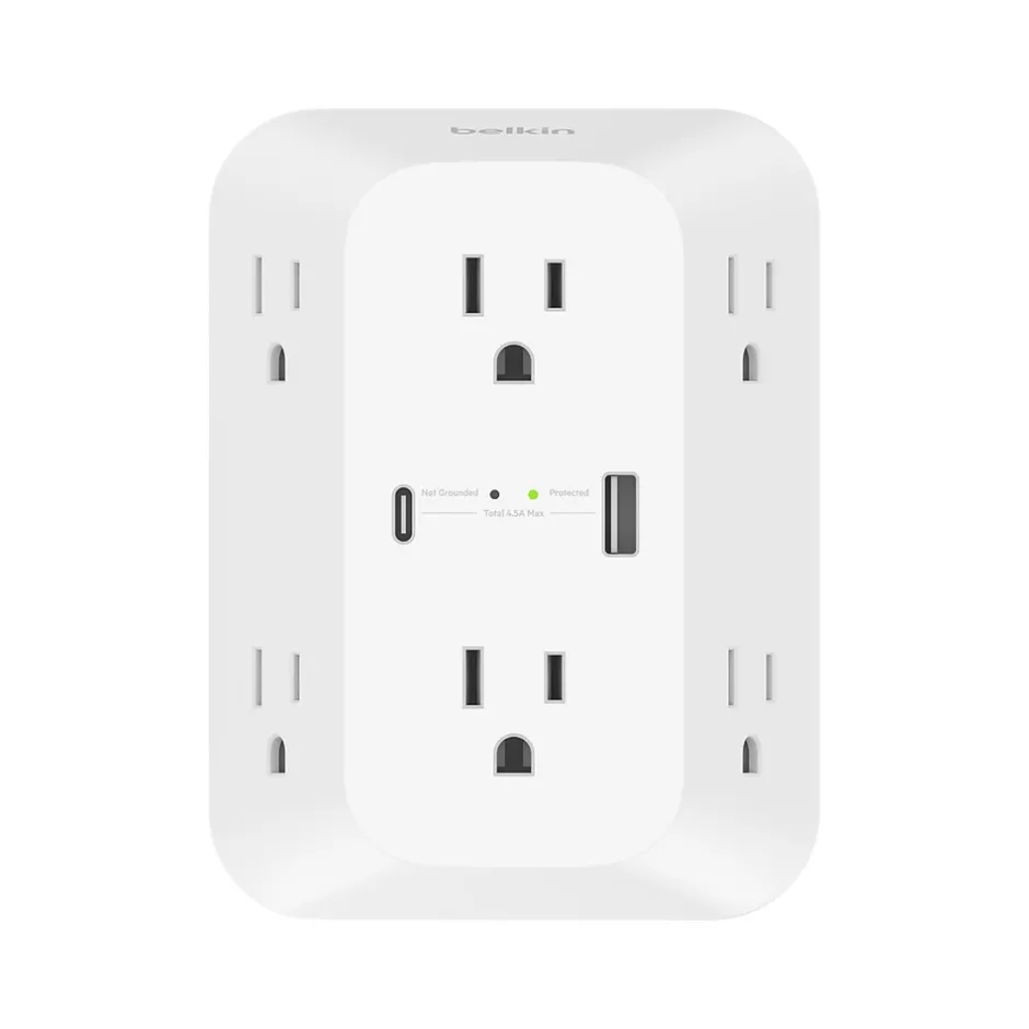 Power up to eight devices with Belkin compact six outlet surge protector with USB-C and USB-A ports. Its smart, space-saving design fits seamlessly with your existing outlet for extra room to charge more devices. It also keeps your laptops, phones, and tablets safe with overvoltage protection.