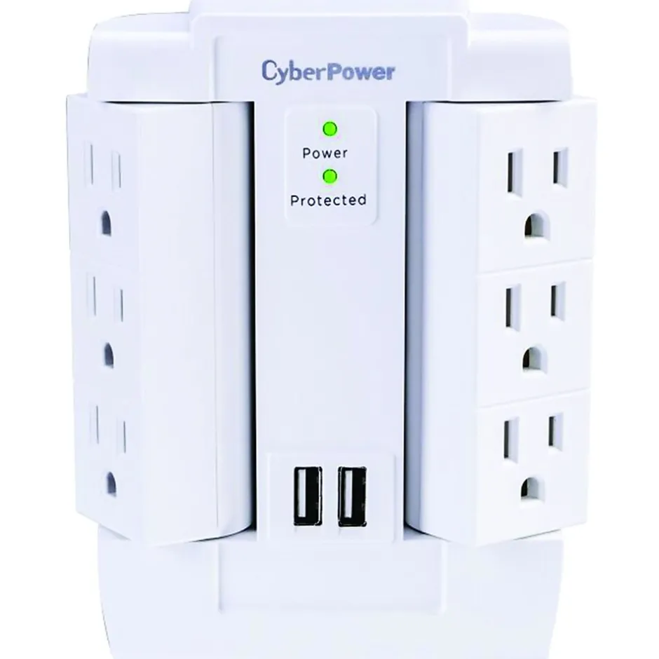 The CyberPower 6-Outlet Swivel Professional Surge Protector Wall Tap with 2 USB Ports is ideal for home or office protection. The surge protector protects personal computers, phones, faxes, modems, printers and more. Its 2 USB ports are perfect for keeping tablets, smartphones and other small electronics ready to use. It features 6 outlets, a wall tap plug, MOV technology and EMI/RFI filters.