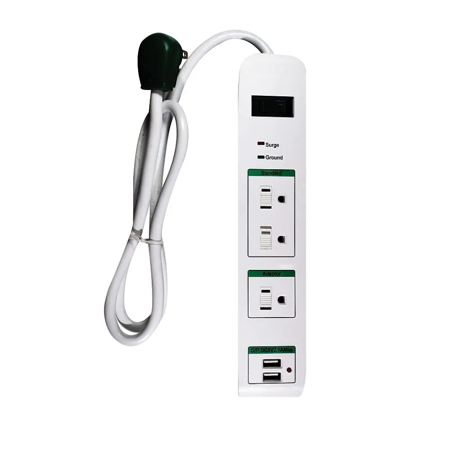 Whoever said good things come in small packages must have been talking about the 3-Outlet Surge Protector w/USB by GoGreen Power®. Designed for peak performance for users on the go, the 3-Outlet Surge Protector w/USB by GoGreen protects your electronics while giving you that much-needed place to park your phone, tablet, or other USB devices for charging. ​​The GoGreen 3-Outlet Surge Protector w/USB sports a 15 amp, 1875 watt circuit breaker providing an incredible 1,200 joules of simultaneous protection for two standard outlets, one large adapter, and two USB ports at once. The compact design includes an indicator light verifying you have active protection at all times, and industry standard EMI/RFI shielding means you’ll never have to wonder about performance or safety. ​With a right-angle plug and a three-foot cord, the GoGreen 3-Outlet Surge Protector w/USB puts power and protection right at your fingertips. And with the environmentally-friendly design of all GoGreen products, you can focus on the task at hand knowing your computers, appliances, and other electronic devices are safe and sound.