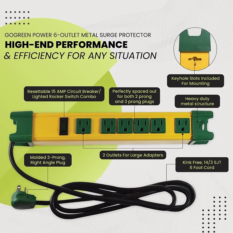 Environmental awareness meets peak performance in the GoGreen Power® 6-outlet metal surge protector. Providing 4 standard outlets, 2 large adapters, and sporting compatibility with any of the most valuable electronic devices, enjoy the benefits that keep on giving with this 100% recyclable product. With 250 joules of protection and a 15 amp circuit breaker, we’re sure to keep even the most valuable electronics safe from unexpected spikes.​A 6-foot power cord helps to ensure an extra outlet available wherever needed, while a built-in indicator light confirms operation so that customers can be sure that an errant electrical surge won’t turn their high-end devices into expensive paperweights. The lifetime warranty and free customer recycling program at iRecycled.com distinguish GoGreen as the leading lifestyle brand in the consumer electronics space. Leave your supplier troubles behind and join the recycling revolution today. The planet needs us all to GoGreen together!