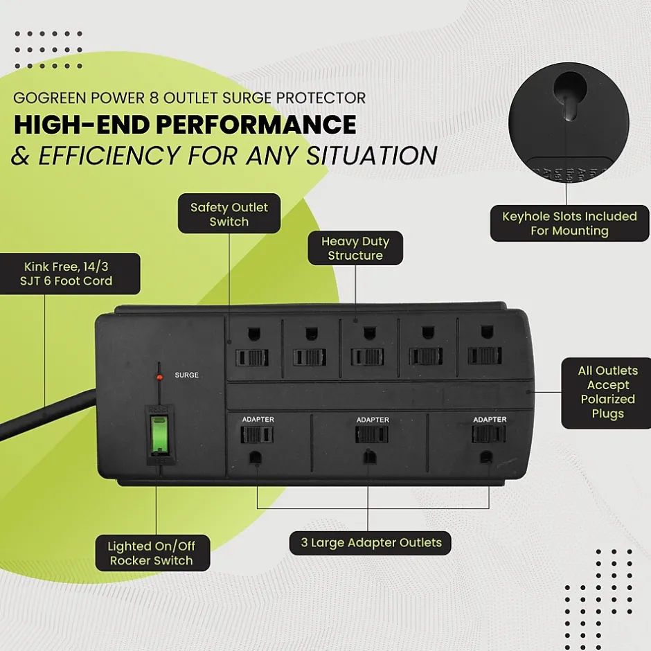 What’s the point of buying high-end electronics if they can all be wiped out by unpredictable occurrences like a bolt of lightning or a brownout? Protecting your computers, televisions, home appliances, and more isn’t optional-it’s essential.With the GoGreen Power® 8-Outlet Surge Protector, you won’t have to wonder if your devices are protected every time the lights flicker. This 15 amp, 1875 watt circuit breaker protects five standard outlets and three large adapters at once. With industry standard EMI/RFI shielding and an active indicator light to confirm operation, you’ll never have to wonder about performance or safety.Coupled with the convenient right-angle plug, the environmentally-friendly design of all GoGreen products combine form and function in a top-notch design geared for maximum safety and efficiency so you can focus on the essential things in life.