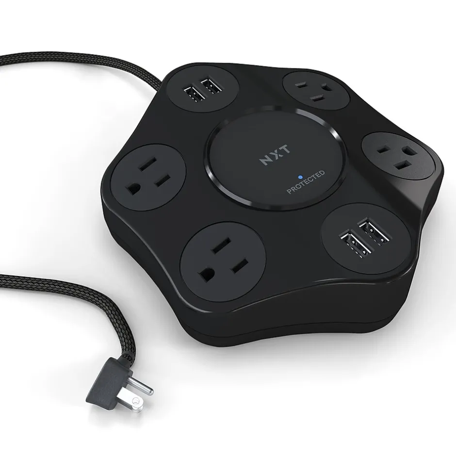 Set up a safe and convenient charging station for a phone, tablet, laptop, printer, and four more devices with this four-USB four-outlet surge protector. The protected light indicator lets you know that surge protection is enabled on your device, while the on-off switch easily cuts power to the unit. The braided cord lends durability and protection against daily abrasions, and the right-angled flat plug lets you plug into hard-to-reach wall outlets. Designed to accommodate up to eight devices, this NXT Technologies™ four-outlet four-USB surge protector includes cord management that keeps devices organized.