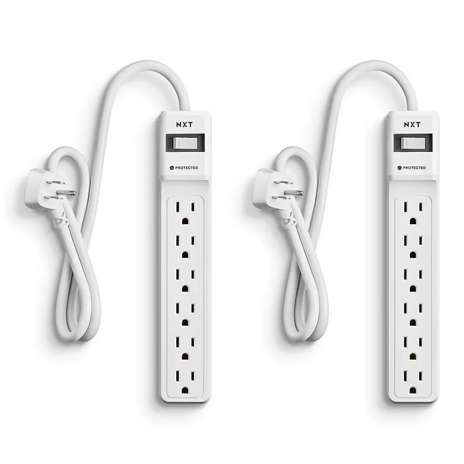 Shield sensitive electronics and their data from potential overload with this convenient 2-pack of surge protectors. Each power strip provides 500 joules of protection to defend against damage from energy spikes and surges. The six outlets are evenly spaced allowing room for a variety of power supplies. Featuring 2.5-foot cords and flat right-angle plugs, these NXT Technologies™ six-outlet surge protectors tuck neatly behind furniture letting you position behind bookcases, desks, tables, or any area with 1″ clearance.