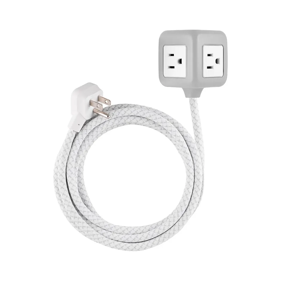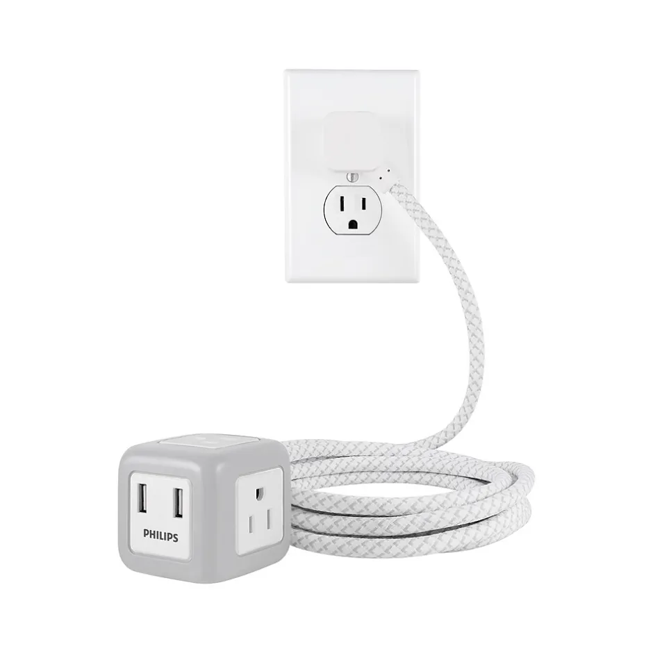 Experience the future of charging with the Philips USB extension cord cube. Featuring three adapter-spaced, grounded outlets and two USB Type-A ports (2.4A) in a unique cube design, this plug-in outlet extender transforms your regular outlet into a safe, multipurpose powering station. Power your everyday household appliances, lamps and seasonal lighting, tools and other electronics all from one location. While most cords interrupt or distract from your home’s decor, this unique designer cable only contributes to the overall charm of your space. The extra-long 10′ woven, white and gray fabric cord cover accents your home or work setup. The extra layer of fabric not only increases the cable’s durability, but also keeps the cord from being bent and tangled.