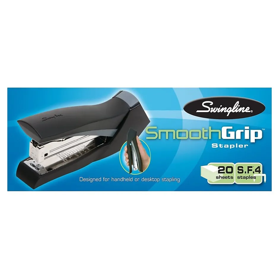 Experience a comfortable grip while using this stapler. This lightweight stapler features a soft plastic shell and an ergonomic design that fits securely in the hand for controlled stapling. A generous 20-sheet capacity mechanism pierces through paper and creates a firm hold to keep documents together. This Swingline SmoothGrip stapler features a magazine release button for simple loading and opens up easily for tackling memos and flyers to bulletin boards.