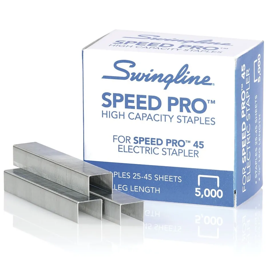 Designed exclusively for use with the Swingline® Speed Pro™ 45 Electric Stapler. The longer 3/8” leg length of these high capacity staples provides a more secure fasten for paper stacks of 25-45 sheets. For sheet counts of less than 25 sheets, switch to Swingline® S.F.® 4® Premium Staples. Premium staples should also be used with the Speed Pro™ 25 Electric Stapler. Speed Pro High Capacity Staples are only compatible with the Speed Pro™ 45. Full staple strips match the stapler magazine. 5,000 silver staples per box.