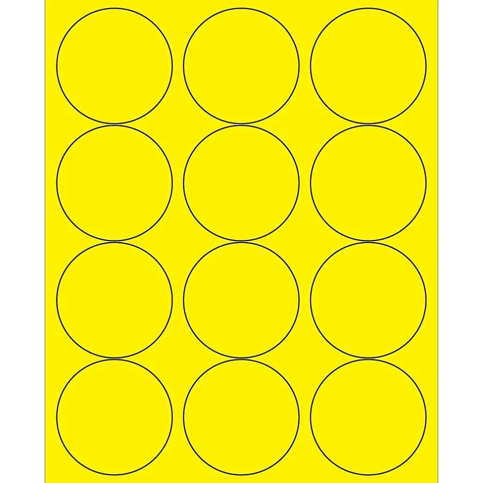 2 1/2″ Fluorescent Yellow Circle Laser Labels. Use to create your own product or mailing labels. Labels work with both Laser and ink jet printers. Permanent adhesive. Labels stick to a variety of smooth surfaces including paper, corrugated, plastic, wood, glass and metal.