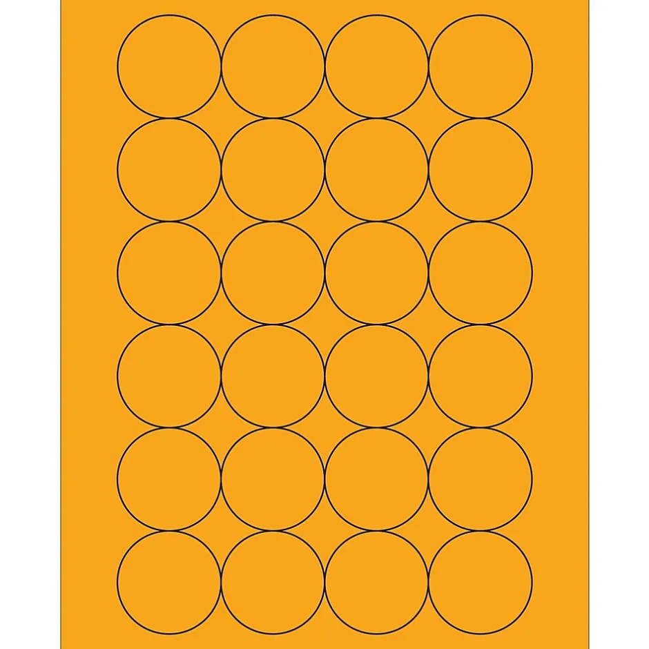 1 2/3″ Fluorescent Orange Circle Laser Labels. Use to create your own product or mailing labels. Labels work with both laser and ink jet printers. Permanent adhesive. Labels stick to a variety of smooth surfaces including paper, corrugated, plastic, wood, glass and metal.