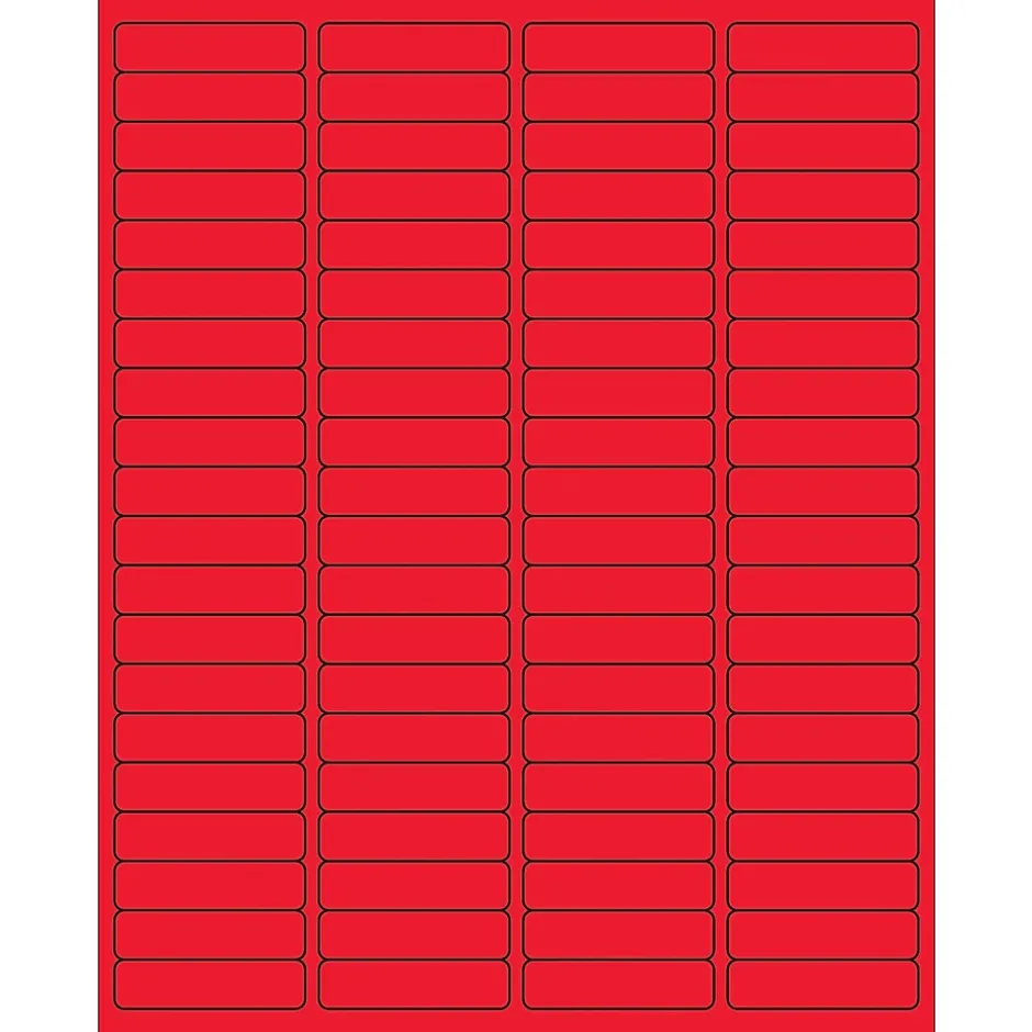 1 15/16 x 1/2″ Fluorescent Red Rectangle Laser Labels. Use to create your own product or mailing labels. Labels work with both laser and ink jet printers. Permanent adhesive. Labels stick to a variety of smooth surfaces including paper, corrugated, plastic, wood, glass and metal.