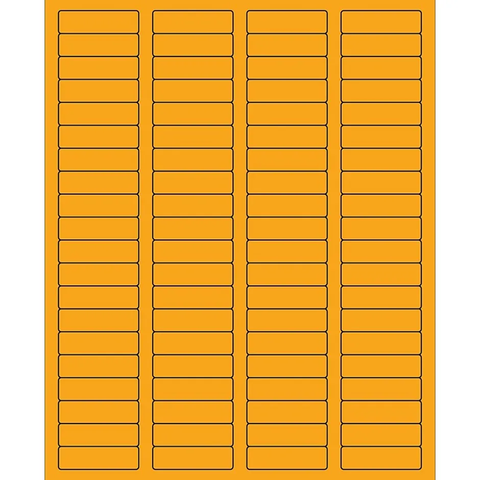 1 3/4″ x 1/2″ Fluorescent Orange Rectangle Laser Labels. Use to create your own product or mailing labels. Labels work with both Laser and ink jet printers. Permanent adhesive. Labels stick to a variety of smooth surfaces including paper, corrugated, plastic, wood, glass and metal.