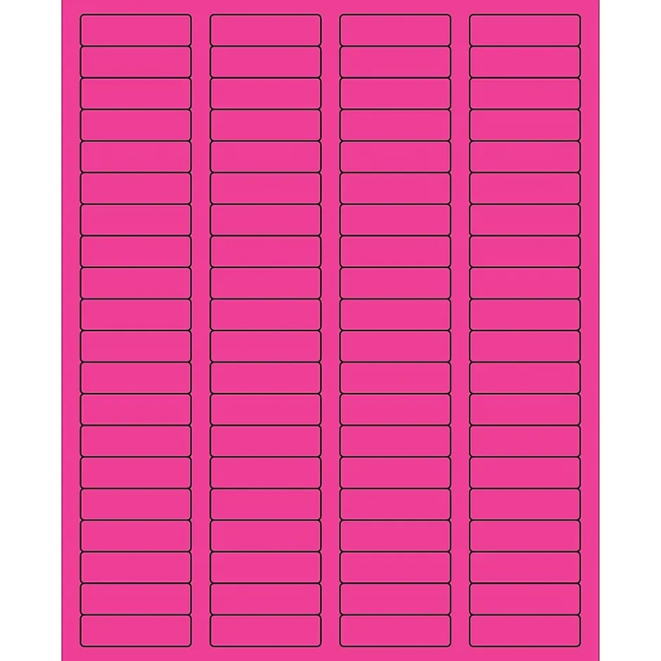 1 3/4″ x 1/2″ Fluorescent Pink Rectangle Laser Labels. Use to create your own product or mailing labels. Labels work with both Laser and ink jet printers. Permanent adhesive. Labels stick to a variety of smooth surfaces including paper, corrugated, plastic, wood, glass and metal.