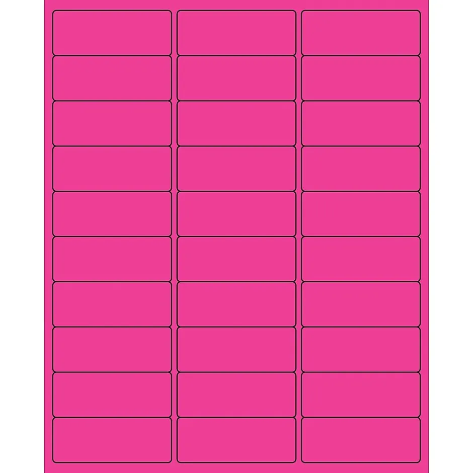 2 5/8″ x 1″ Fluorescent Pink Rectangle Laser Labels. Use to create your own product or mailing labels. Labels work with both Laser and ink jet printers. Permanent adhesive. Labels stick to a variety of smooth surfaces including paper, corrugated, plastic, wood, glass and metal.