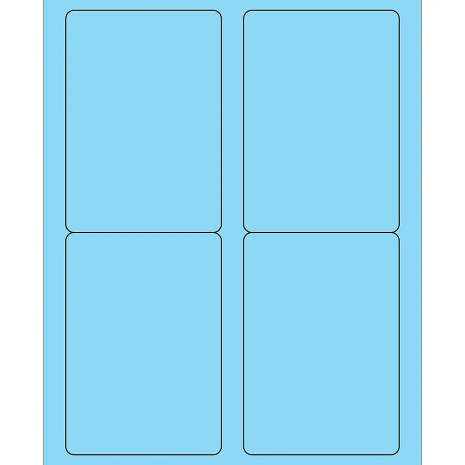 3 1/2″ x 5″ Fluorescent Pastel Blue Rectangle Laser Labels. Use to create your own product or mailing labels. Labels work with both Laser and ink jet printers. Permanent adhesive. Labels stick to a variety of smooth surfaces including paper, corrugated, plastic, wood, glass and metal.