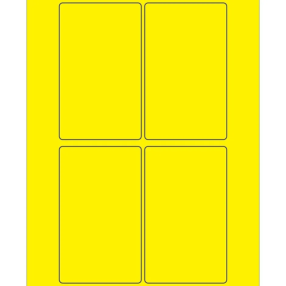 3″ x 5″ Fluorescent Yellow Rectangle Laser Labels. Use to create your own product or mailing labels. Labels work with both Laser and ink jet printers. Permanent adhesive. Labels stick to a variety of smooth surfaces including paper, corrugated, plastic, wood, glass and metal.