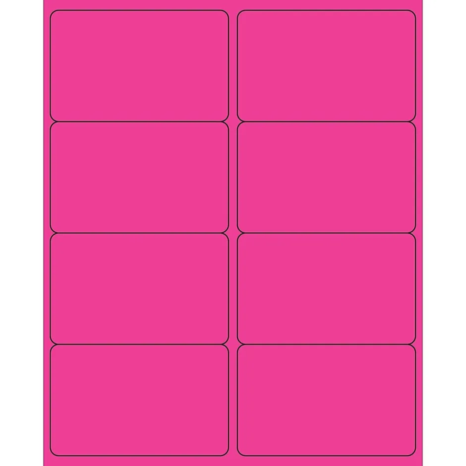 4″ x 2 1/2″ Fluorescent Pink Rectangle Laser Labels. Use to create your own product or mailing labels. Labels work with both Laser and ink jet printers. Permanent adhesive. Labels stick to a variety of smooth surfaces including paper, corrugated, plastic, wood, glass and metal.