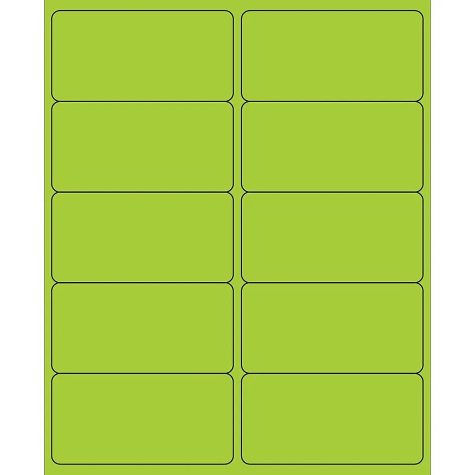 4″ x 2″ Fluorescent Green Rectangle Laser Labels. Use to create your own product or mailing labels. Labels work with both Laser and ink jet printers. Permanent adhesive. Labels stick to a variety of smooth surfaces including paper, corrugated, plastic, wood, glass and metal.