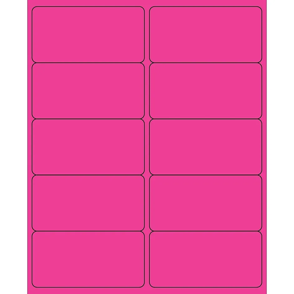 4″ x 2″ Fluorescent Pink Rectangle Laser Labels. Use to create your own product or mailing labels. Labels work with both Laser and ink jet printers. Permanent adhesive. Labels stick to a variety of smooth surfaces including paper, corrugated, plastic, wood, glass and metal.