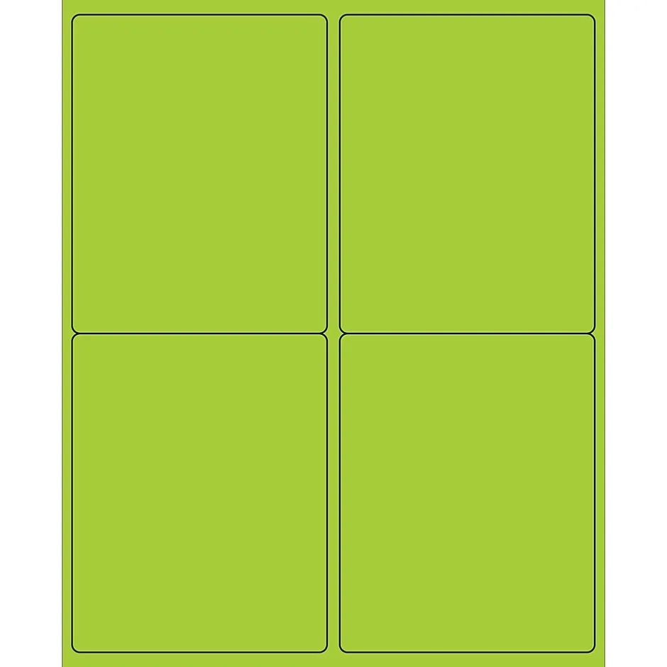 4″ x 5″ Fluorescent Green Rectangle Laser Labels. Use to create your own product or mailing labels. Labels work with both Laser and ink jet printers. Permanent adhesive. Labels stick to a variety of smooth surfaces including paper, corrugated, plastic, wood, glass and metal.