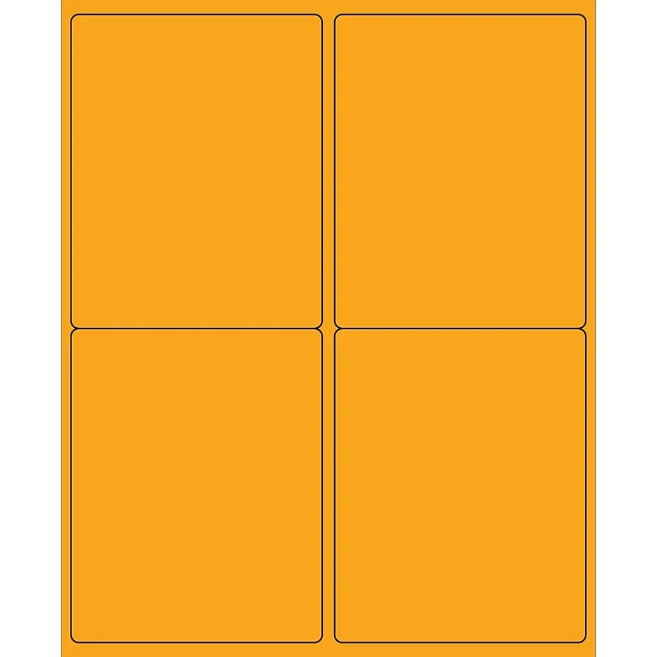 4″ x 5″ Fluorescent Orange Rectangle Laser Labels. Use to create your own product or mailing labels. Labels work with both Laser and ink jet printers. Permanent adhesive. Labels stick to a variety of smooth surfaces including paper, corrugated, plastic, wood, glass and metal.