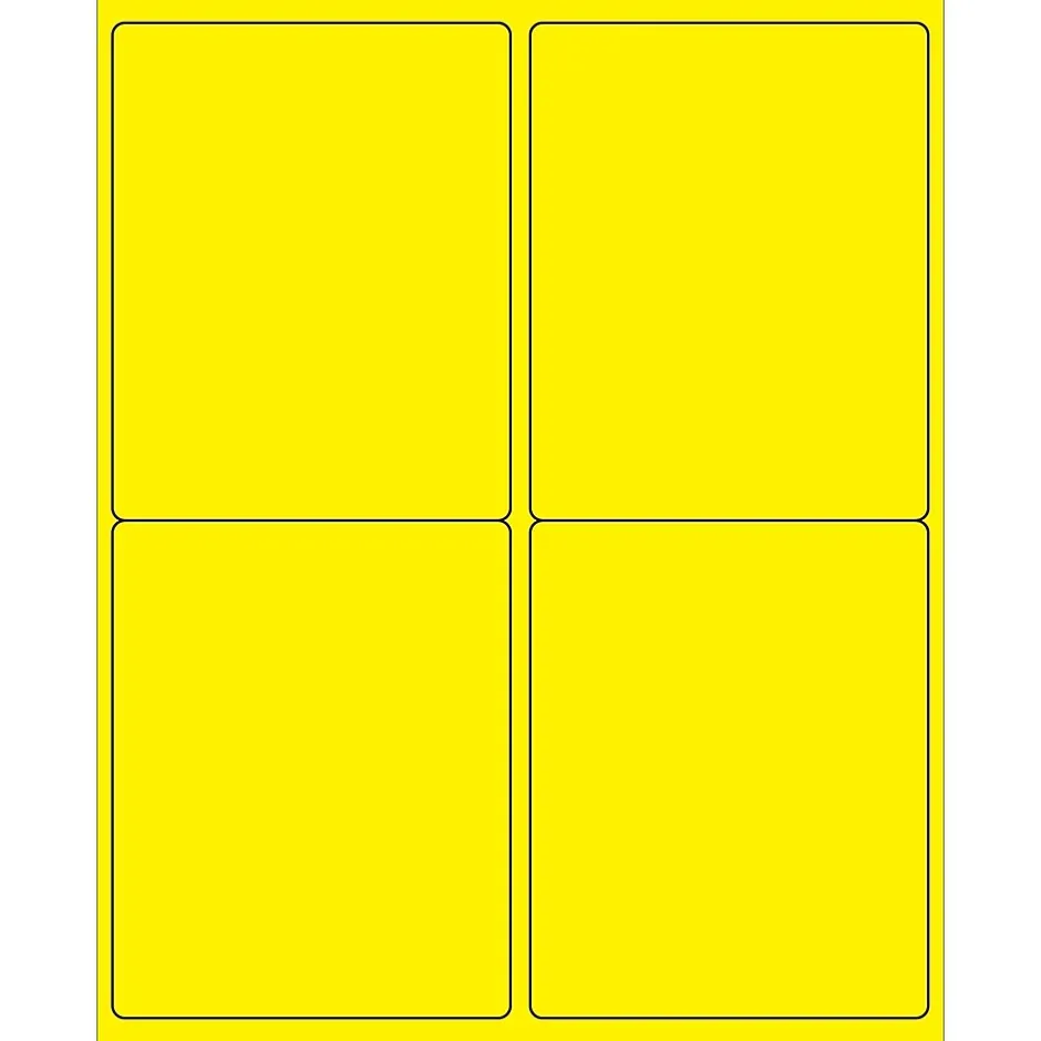 4″ x 5″ Fluorescent Yellow Rectangle Laser Labels. Use to create your own product or mailing labels. Labels work with both Laser and ink jet printers. Permanent adhesive. Labels stick to a variety of smooth surfaces including paper, corrugated, plastic, wood, glass and metal.