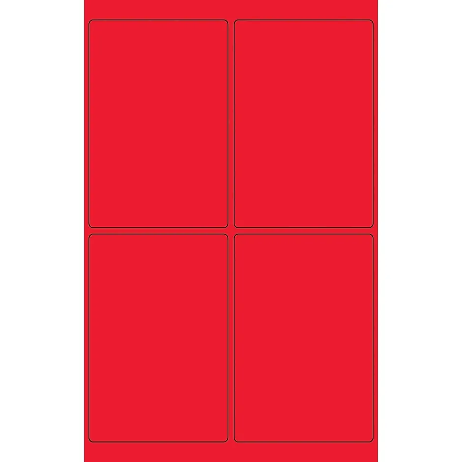 4 x 6″ Fluorescent Red Rectangle Laser Labels. Use to create your own product or mailing labels. Labels work with both laser and ink jet printers. Permanent adhesive. Labels stick to a variety of smooth surfaces including paper, corrugated, plastic, wood, glass and metal.