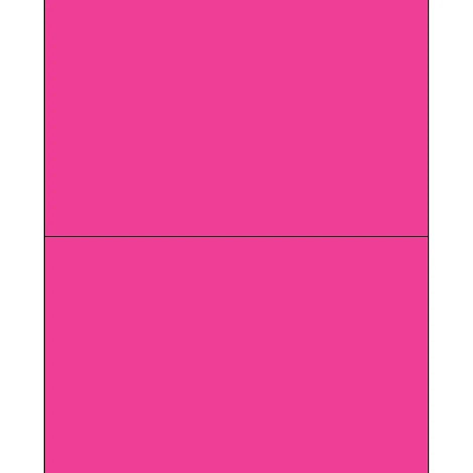 8 1/2″ x 5 1/2″ Fluorescent Pink Rectangle Laser Labels. Use to create your own product or mailing labels. Labels work with both Laser and ink jet printers. Permanent adhesive. Labels stick to a variety of smooth surfaces including paper, corrugated, plastic, wood, glass and metal.