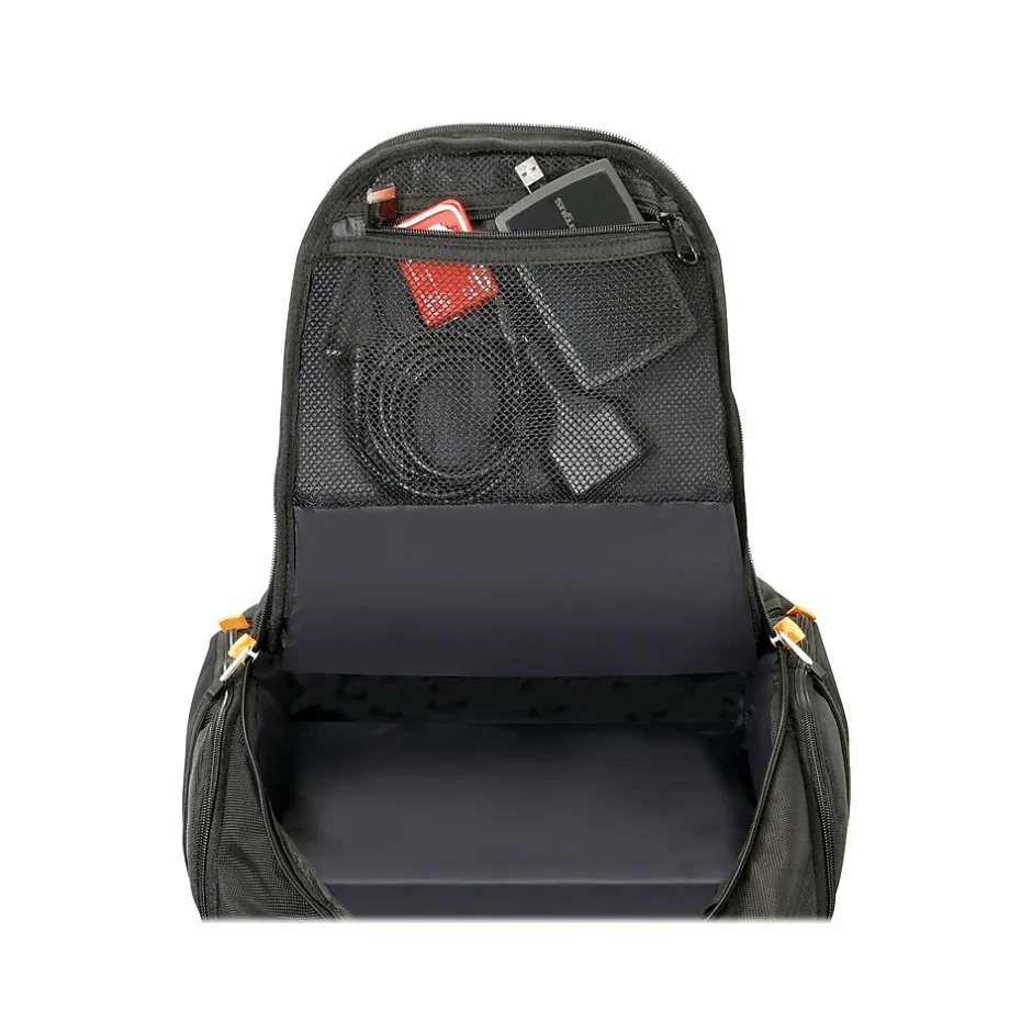 - Main front compartment includes pockets for business cards, a mesh accessory pocket, and a key clip
