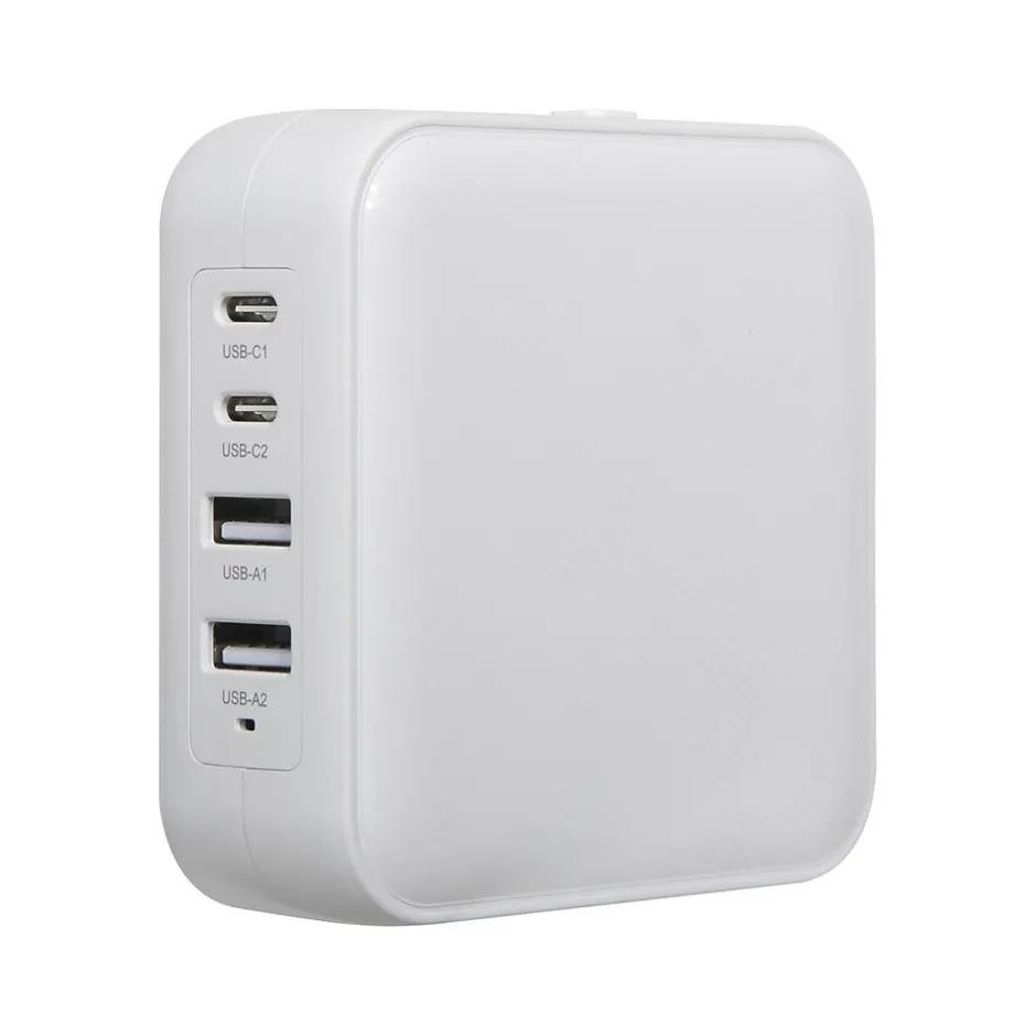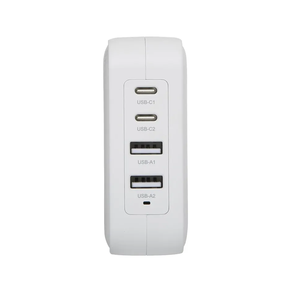 Count on high power delivery that lasts longer than traditional chargers with the Targus PowerElite 100W GaN wall charger. Powered by effective GaN technology, this charger packs a powerful punch with four ports: two USB Type-C (one port uses up to 100W) and two USB Type-A ports with quick charge capabilities (up to 18W), so you could essentially charge your work laptop, personal laptop, phone, and tablet at the same time. GaN charging is more efficient in power transfer, so it uses less energy and disperses less heat as it works. This means a cooler and safer charging for you. Like all Targus products, this charger passes strict quality and safety standards and meets UL requirements. This charger is travel-friendly and comes with interchangeable plugs compatible with power outlets in over 140 countries in the Americas, Asia, Europe, and Australia. From its lightweight structure and slim, compact design, the charger won’t take up prime real estate in your space. Its US plug has foldable prongs, making it easy to slip into your briefcase or backpack on the go.