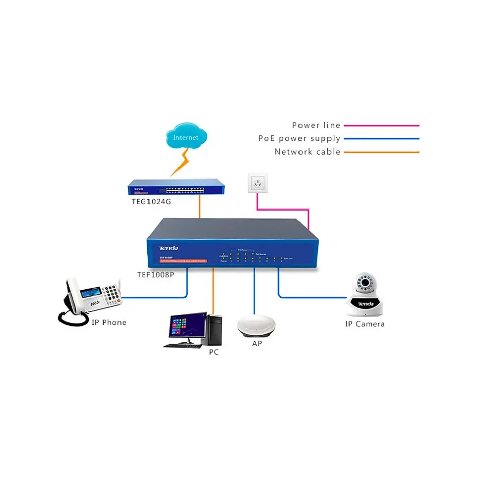 Tenda TEF1008P is a 10/100Mbps desktop unmanaged switch with eight ports, four of which are with PoE. These PoE ports can automatically detect and supply power to IEEE 802.3af compliant PDs. Thanks to PoE ports, devices can be charged along with data transfer.