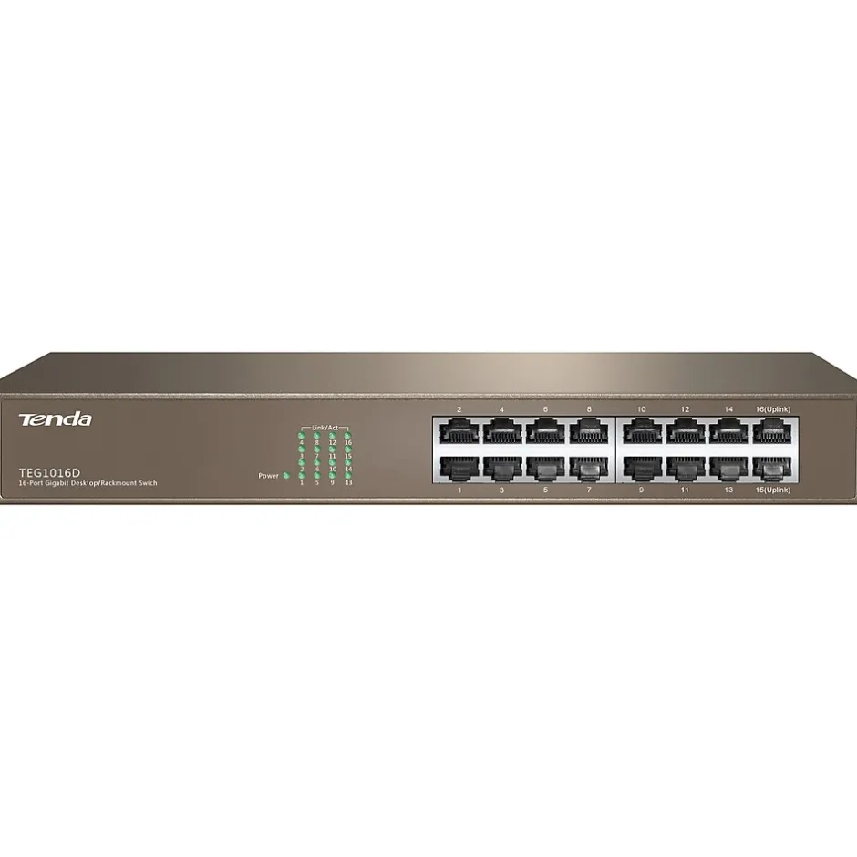 Tenda TEG1016D features 16 10/100/1000Mbps auto-negotiation RJ45 ports, up to 2000Mbps of full duplex transmission rate, line-speed forwarding by all ports, and large cache capacity to ensure the timely transfer of large files and stable video streaming. Professional integrated lightning protection circuit enables all the 16 ports to provide IV-class (6 kV in common mode) lightning protection, effectively decreasing the damage rate to the ports by lightning surge.