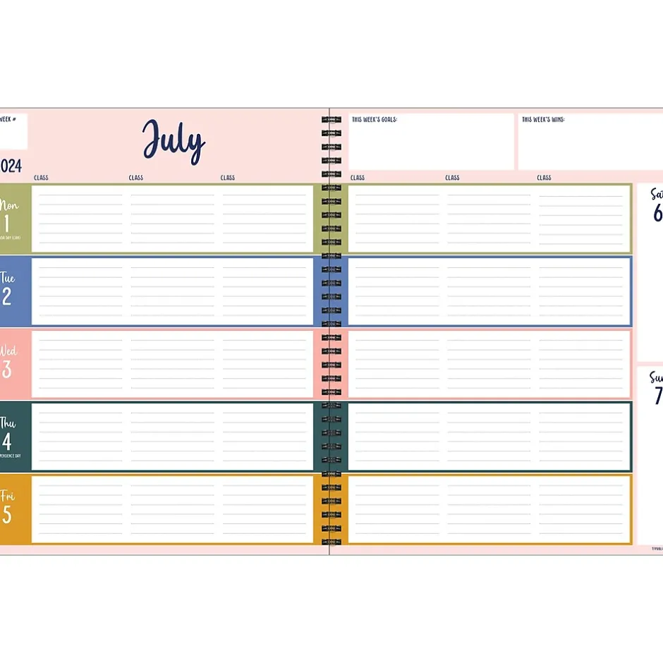 The TF Publishing teacher planner is designed by teachers for teachers, and packs a punch, so you only need one planner for the entire year. The monthly spreads include a monthly overview on the left side and a lined notes page on the right. The weekly pages allow for up to six class overviews to be planned for each school day. Each grid box is the size of a small sticky note.