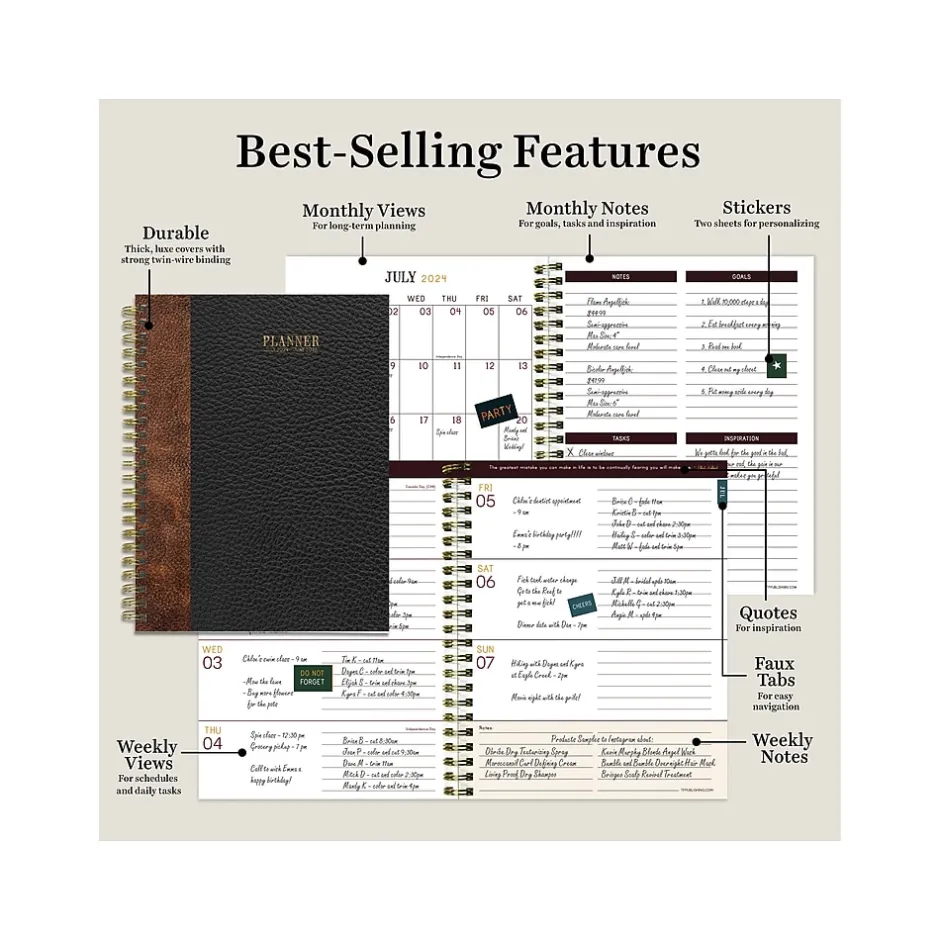 - Weekly spreads for schedules, daily tasks, and priorities; monthly views for long-term planning with sections for monthly goal setting, notes, tasks, and inspiration