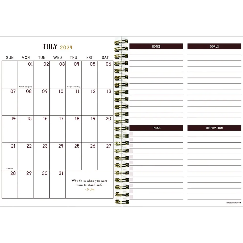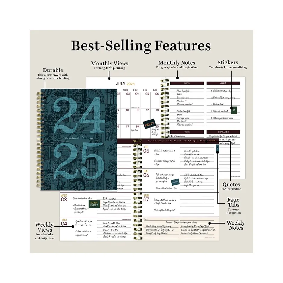- Weekly spreads for schedules, daily tasks, and priorities; monthly views for long-term planning with sections for monthly goal setting, notes, tasks, and inspiration