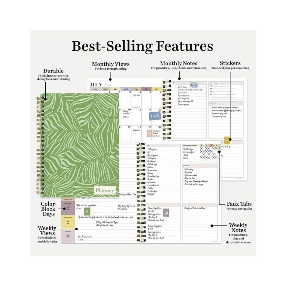 - One month per view, one week per view, monthly lists, weekly habit tracker, weekly notes, weekly priorities, weekly lists, and color-segmented days
