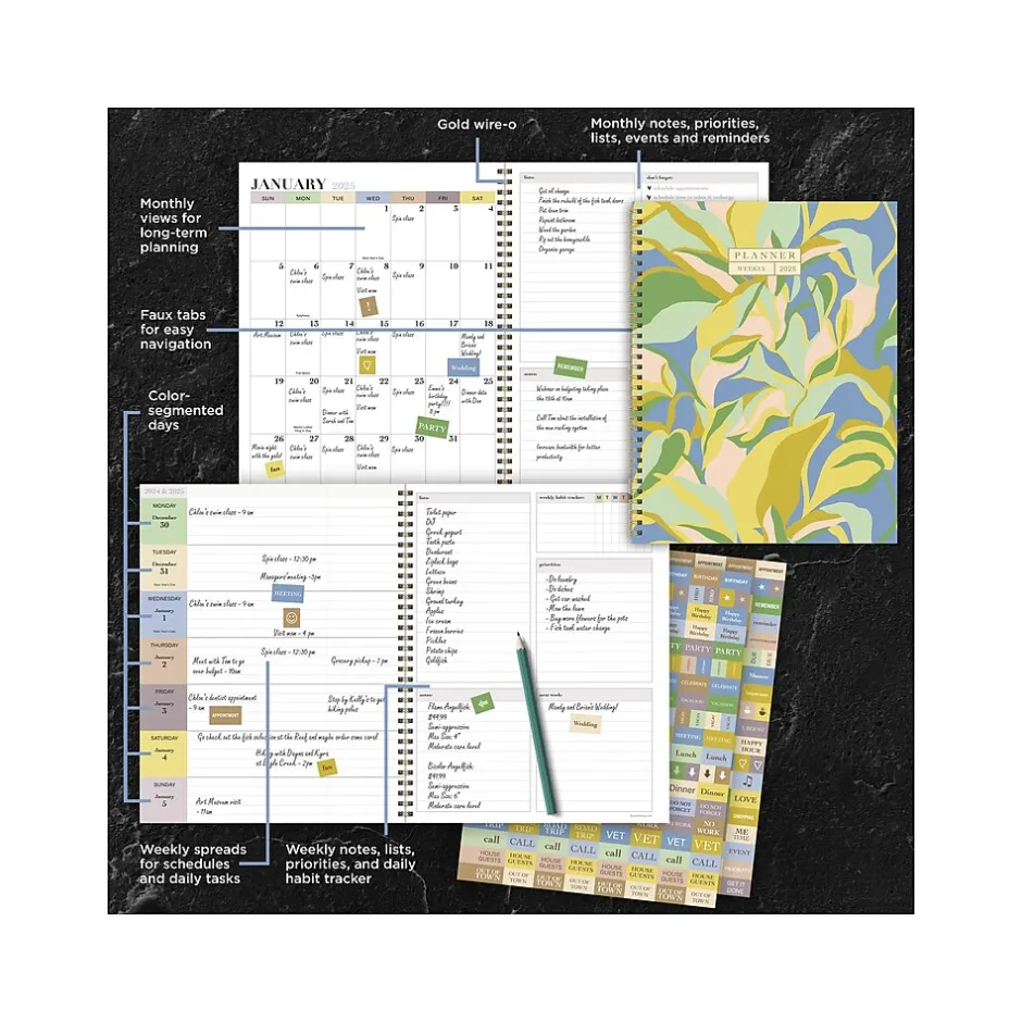 As pretty as it is functional, the TF Publishing 2025 planner is sure to keep you organized. This all-encompassing large weekly and monthly planner boasts two-page monthly spreads that include ruled sections for notes, tasks and goals, and two-page weekly spreads with ruled daily sections to keep your plans neat and organized, plus a dedicated weekly priorities section to help keep you focused. The interior pages are designed with a classic and refined feel and accented with faux monthly tabs for easy access to weekly planning. Enhance your daily plans with 368 color-coordinating stickers to highlight special occasions and personalize your planner. Bonus ruled notes pages are in the back, with yearly 2025 and 2026 views in the front. Featuring a durable cover with an exotic floral design and sophisticated gold-tone wire-O binding designed to lay flat when open, this planner covers 12 months from January 2025 to December 2025 and contains no plastic.