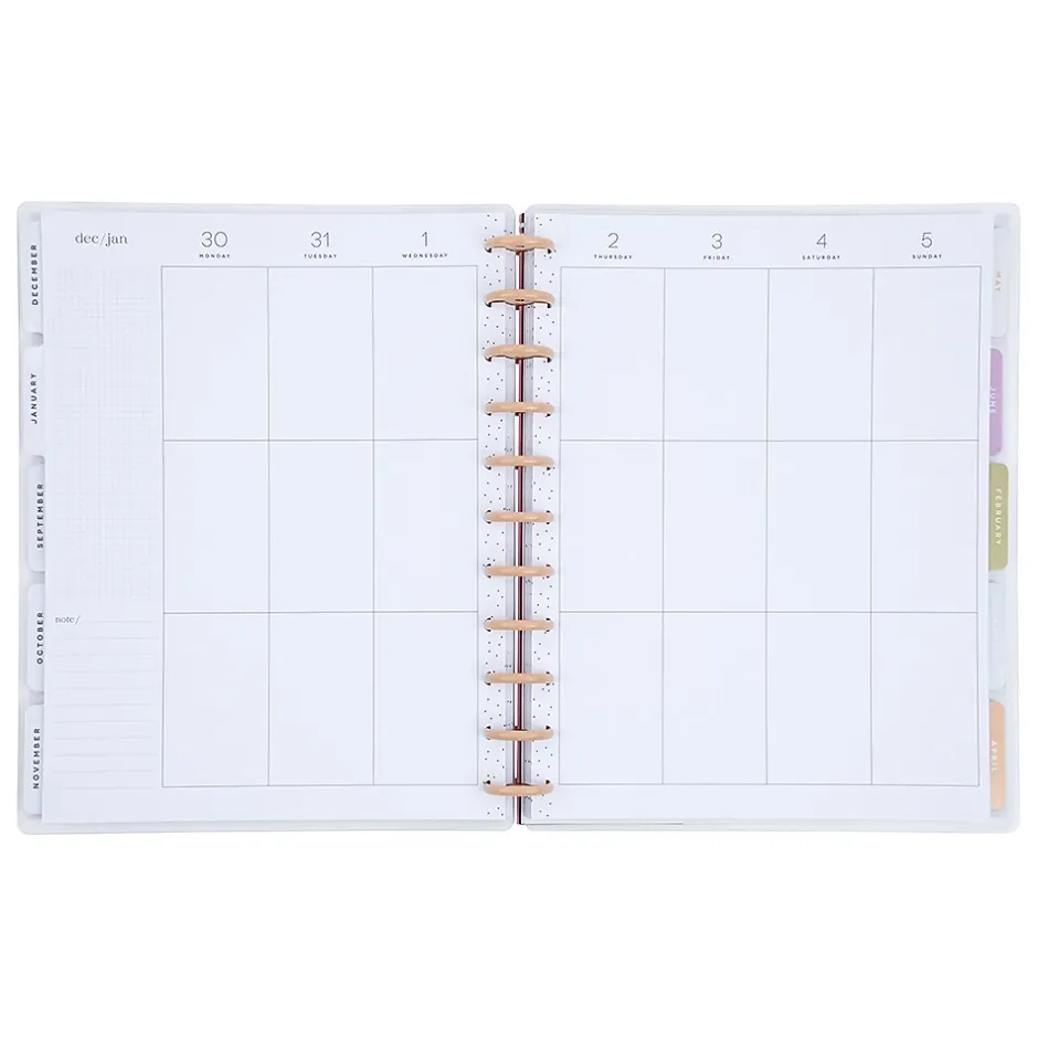- Features dated two-page monthly and weekly spreads; the vertical layout on the weekly spreads includes three daily boxed spaces that can be divided into morning, afternoon and evening, or between work, school, and personal activities