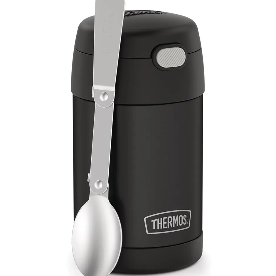 The 16 Oz. FUNtainer Stainless Steel Food Jar is vacuum-insulated to keep hot foods hot and cold foods cold—and since it’s designed for kids it’s also colorful and fun. The FUNtainer food jar is light weight and compact so it’s easy to carry on the go. Kids work hard and once lunchtime hits they need the healthy stuff to power them through the rest of the day. This handy kids food container has a wide mouth, which lets them gobble and gulp their food right out of the bright-colored jar, and the included folding spoon is super convenient! Send them to school with Mom’s homemade soup so they can enjoy it fresh and hot at lunch time. If they’re in the mood for a cold snack, pack it up with yogurt and berries, or apples and peanut butter. To clean, you can pop your Black Matte FUNtainer food jar in the dishwasher; however washing by hand is recommended.
