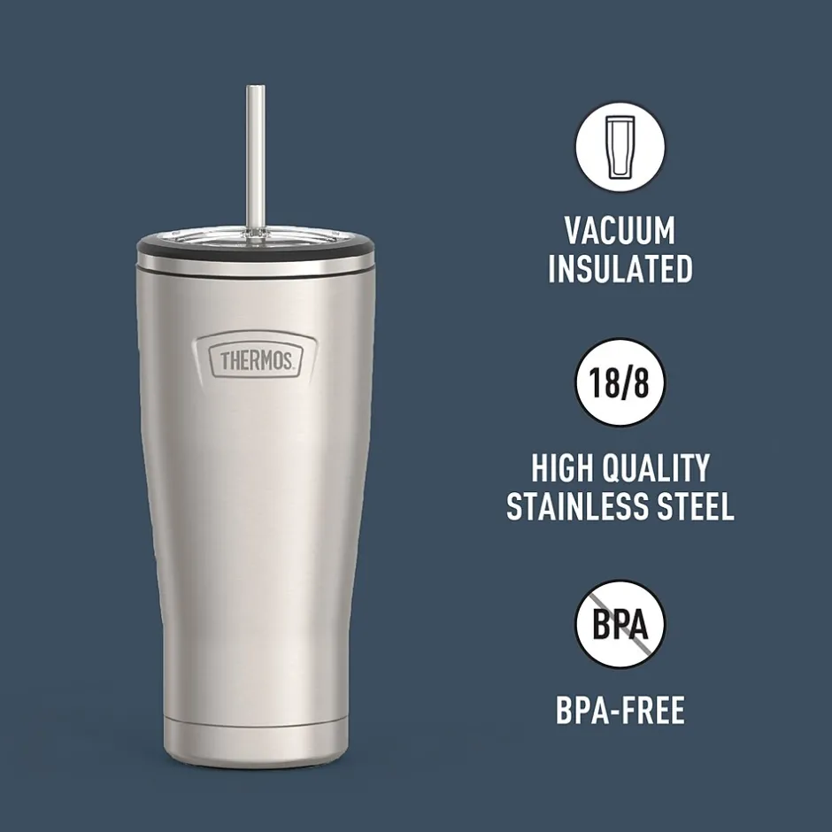 Starts cold. Stays cold. The Icon™ 24-Oz. Stainless Steel Cold Tumbler with Straw from Thermos® helps you stay hydrated to take on the day. It comes equipped with a stainless steel straw to keep up with whatever your day has in store. From the nonslip Griptec™ base to superior vacuum insulation and durable True-Coat™ finishes, the Icon™ Series by Thermos® is an ideal tumbler for everyday use. It’s dishwasher safe, but don’t use with hot liquids.