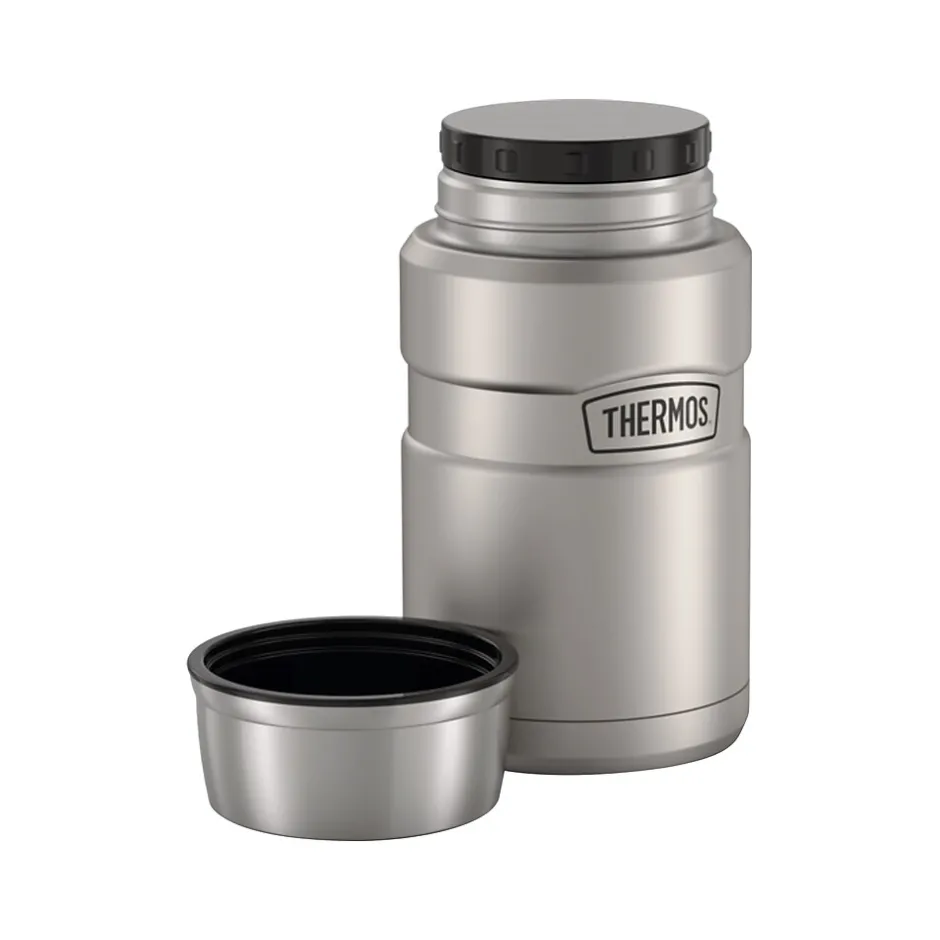 The Thermos King 24 oz. stainless steel food jar is perfect for storing hot and cold foods. The food will stay cold for up to 24 hours and hot for 14 hours. The lid can be used as a serving cup, while the wide mouth makes the food jar easy to fill and clean. The compact design is lightweight and portable.