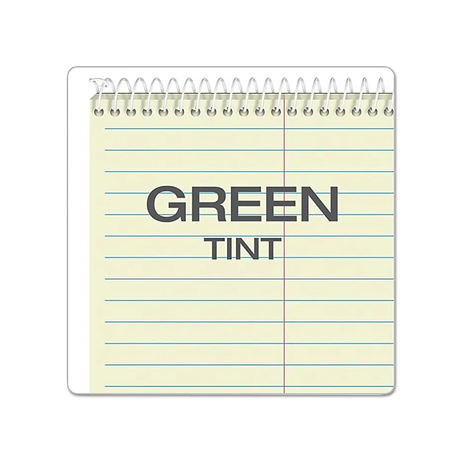 The classic flip-top format gives quick access to notes and lists. The 6″ x 9″ size tucks easily into any backpack or bag. Perforated sheets detach easily. A sturdy no-snag coil resists catching on papers or clothing. Proudly made in the USA. Assorted color covers: red, black, blue & green. Green tint paper. Gregg ruled, 80 sheets. 4 Pack.