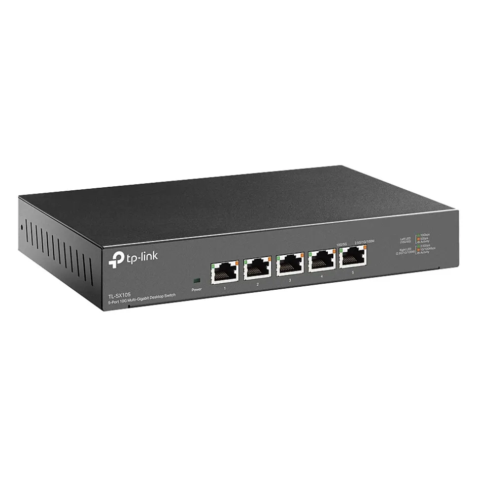 As the flagship 10G product, the TP-LINK TL-SX105 is a five-port 10G desktop switch, providing up to 100Gbps of switching capacity. Auto negotiation five-speed (100Mbps/1G/2.5G/5G/10G) connections sense the link speeds and intelligently adjust for compatibility and optimal performance for all your devices, including 10G NAS, 10G server, workstation, gaming computer, 2.5G/5G/10G Wi-Fi 6 AP, 8K video, desktop, and more.
