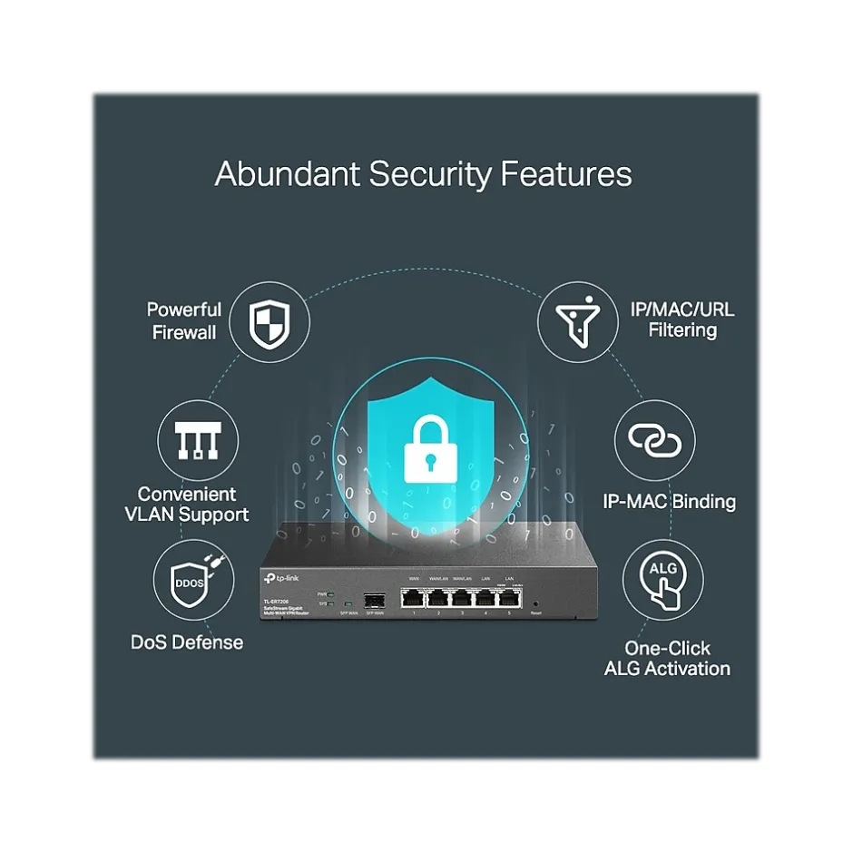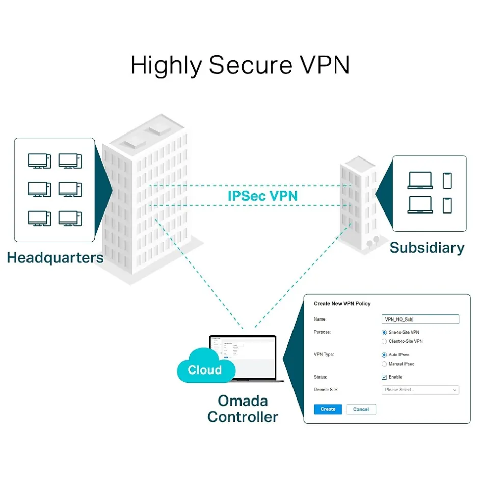 As the gateway that seamlessly integrates into the Omada Software Defined Networking (SDN) platform, this router allows for remote and centralized management, anywhere, anytime. Standalone management via the web UI or app is also available to maximize convenience, allowing for hassle-free 100% centralized cloud management of the whole network from different sites, all controlled from a single interface anywhere, anytime. The multi-WAN Load Balancing function distributes data streams according to the bandwidth proportion of every WAN port to raise the utilization rate of multiline broadband. Supports IPSec/PPTP/L2TP VPN over IPSec/SSL protocols. One-click auto IPSec VPN greatly simplifies VPN configuration and facilitates network management and deployment while also securing and encrypting private site-to-site data communications traveling over the Internet.