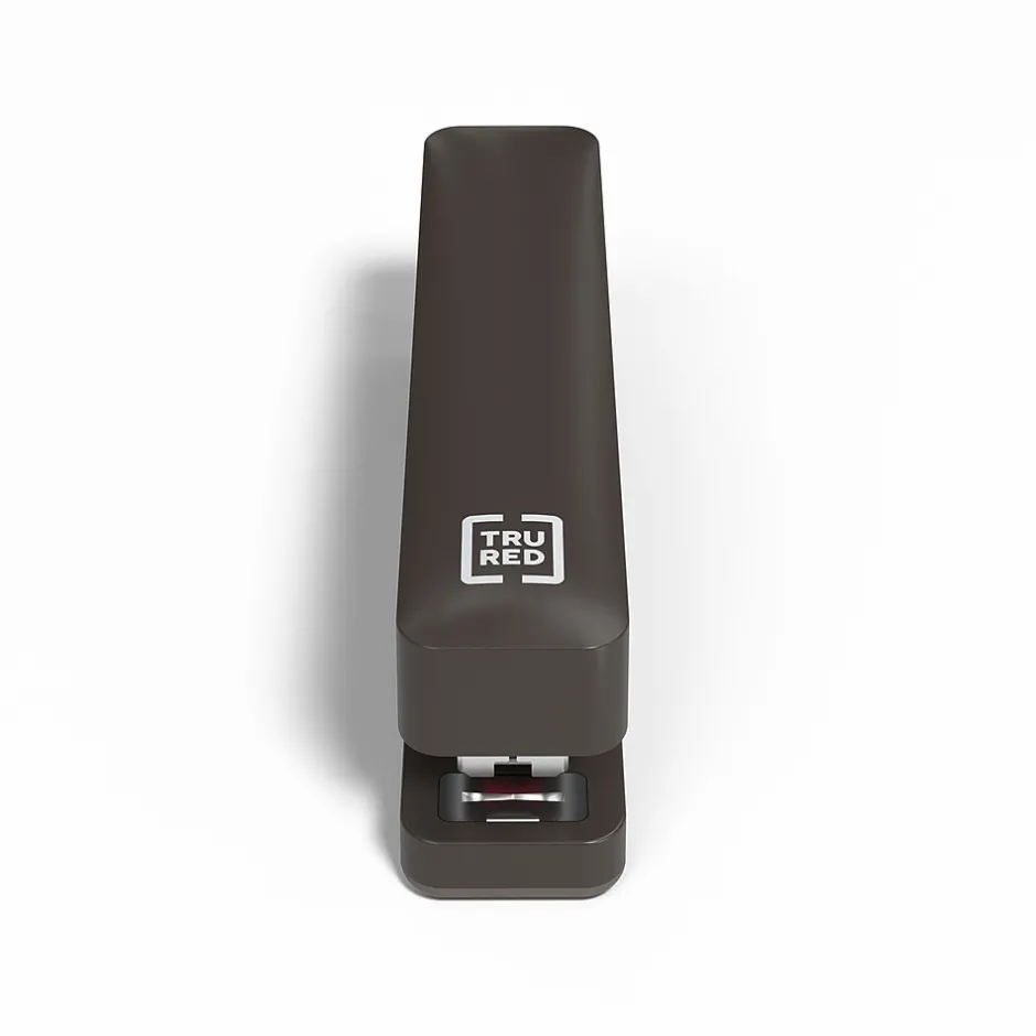 Keep this half-strip stapler in your drawer to handle paperwork. With a rubber grip on the bottom, this stapler offers an easy grip and stable use on your work surface. A convenient low-staple indicator lets you know when it’s time for a refill. This TRU RED half-strip stapler opens flat for tacking and has a top-loading design for effortless reloading.