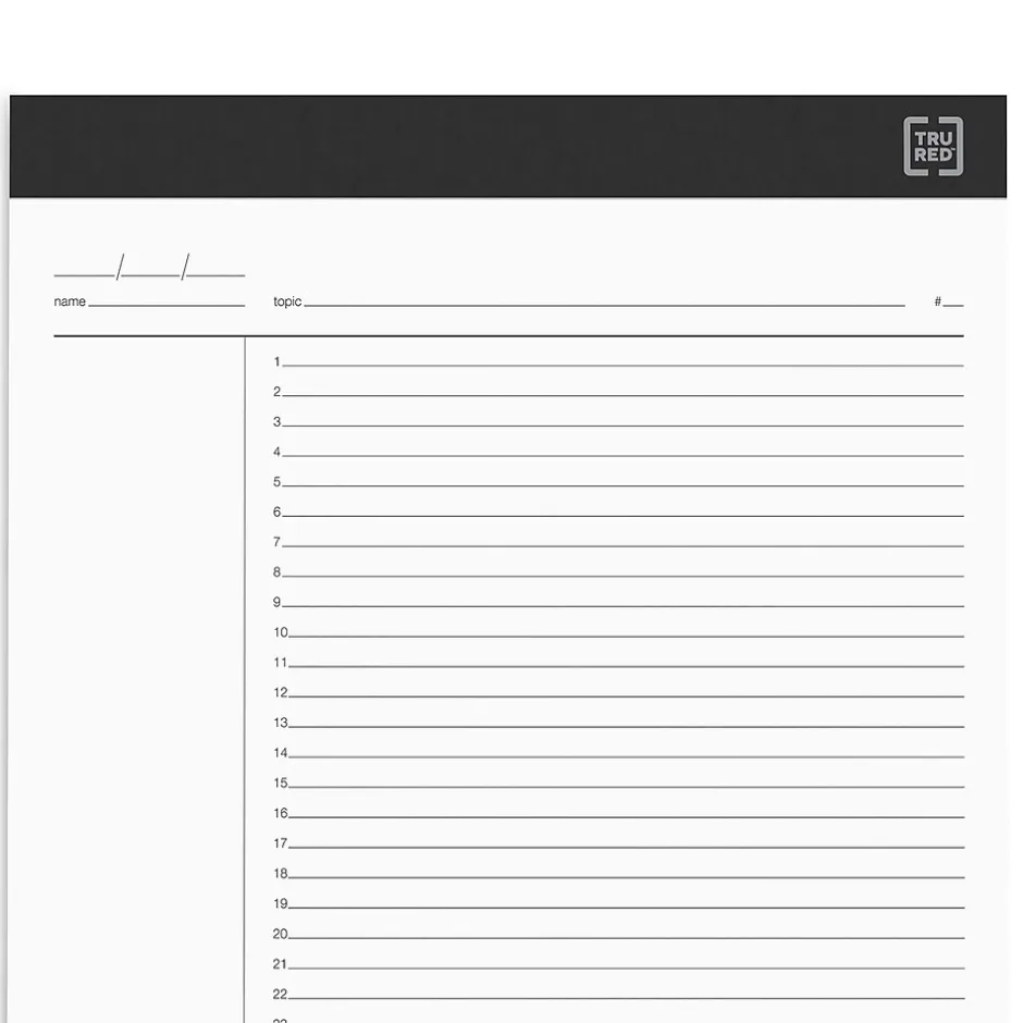 Write easily on the rigid surface of these heavyweight notepad. The top-bound construction lets you turn to a fresh page during note-taking, while the perforated design supports easy sharing. Featuring a project planning template, this notepad lets you capture important details for later review. These TRU RED™ 8.5 x 11.75-inch white heavyweight notepads has a 20-pound paperweight for a sturdy feel and durability.