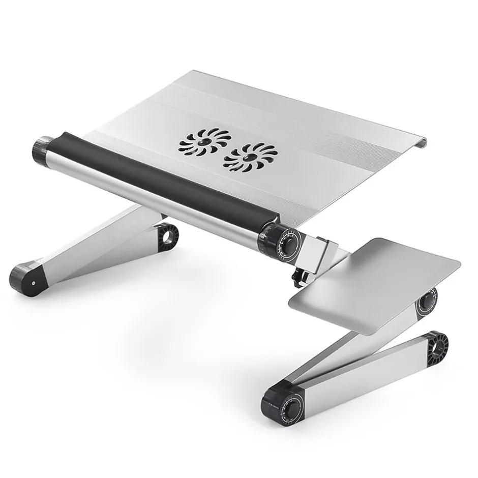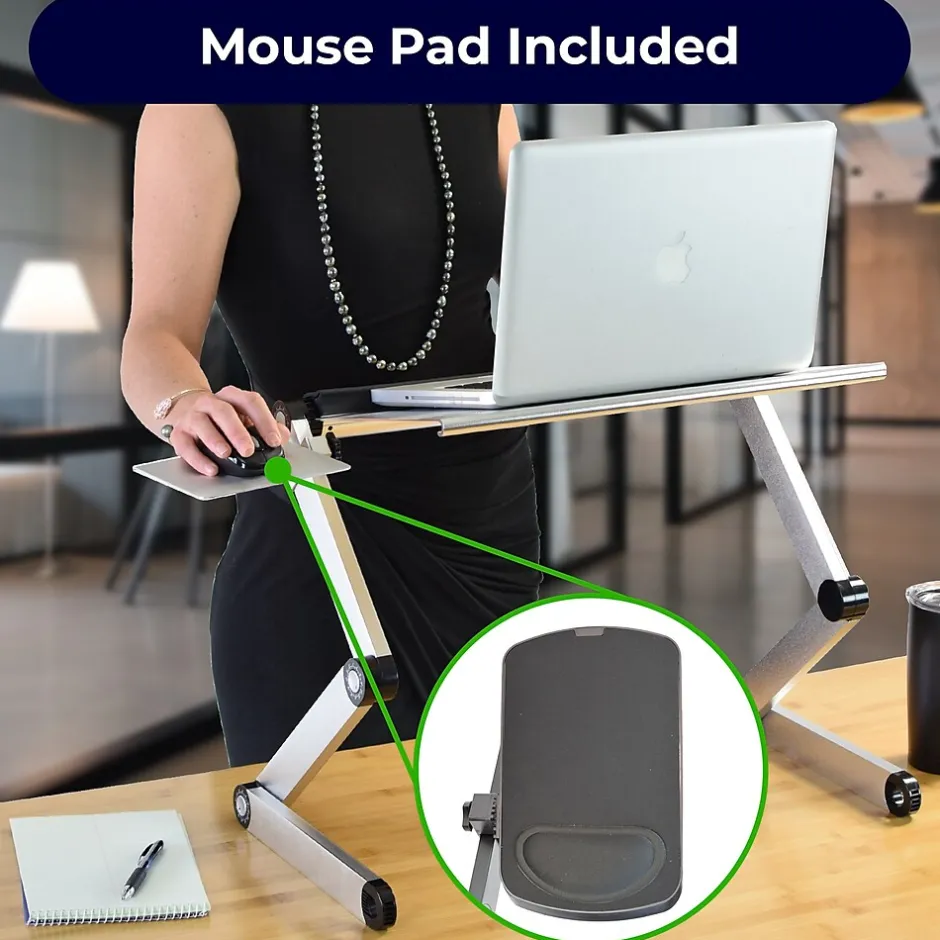 Work more places more comfortably. Meet the nimble WorkEZ Cool – 2 fans cool laptops – 3 USB Ports power devices – triple-section legs with special “knees” stay at the angle you select for each of them (hundreds of combinations) – a top metal tray tilts and the small ledge keeps things from rolling off – you can clamp its mouse pad onto either leg – and when you’re done it all folds away into a surprisingly thin, flat package. Hands down the most functional and versatile laptop stand. WorkEZ Cool works everywhere! Benches, beds, easy chairs, desks, passenger seats, even beach towels become easier places to get onto your gear. Put it on a desk or table to create an instant laptop standing desk. Slip it over your lap on the couch. Stretch out under the platform in bed – it’s super comfortable. Folds away into an easy-to-stow package.